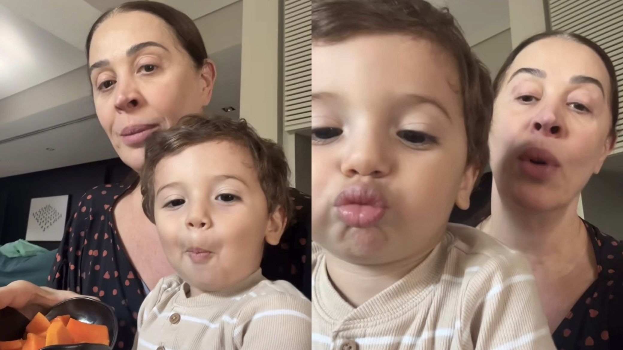 “Como é que chama essa fruta?”, pergunta Claudia Raia, no vídeo publicado nesta quarta-feira (20). “Mamão”, responde Luca. Na sequência, a estrela de “A Favorita” e “Sassaricando” agradece a resposta do filho, que repete a palavra.
