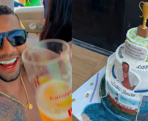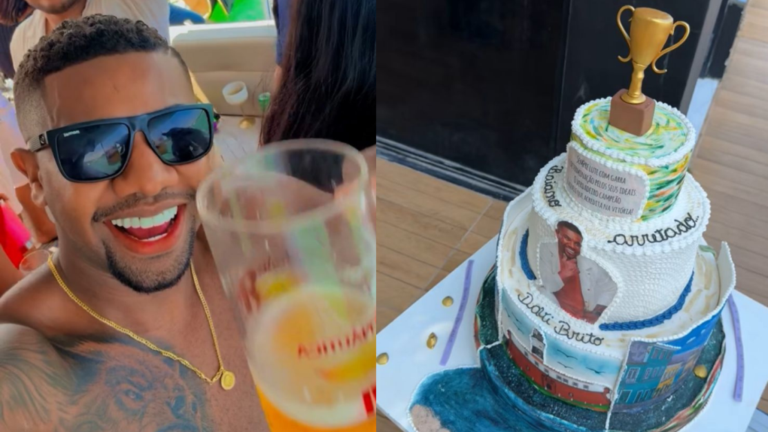 Com um troféu no topo e uma foto do ex-motorista de aplicativo, o bolo ainda consta a seguinte frase: “Sempre lute com garra e determinação pelos seus ideais. O verdadeiro campeão é aquele que acredita na vitória!”. No Instagram, ele também postou um vídeo dançando ao lado de seus amigos, em um barco.