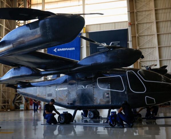 A fabricante de aeronaves elétricas Eve apresentou pela primeira vez o protótipo em escala real de seu “táxi voador”, alcançando um marco, já que a empresa pretende que o modelo obtenha certificação e entre em serviço em 2026.