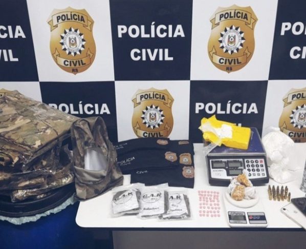 Durante a ação, uma mulher foi presa em flagrante em Novo Hamburgo, enquanto monitorava a movimentação em frente a um depósito. No local, os agentes encontraram drogas, munições de calibre restrito (9mm), balanças de precisão, celulares e diversos itens que imitavam uniformes e equipamentos da Polícia Civil e de grupos de operações especiais.