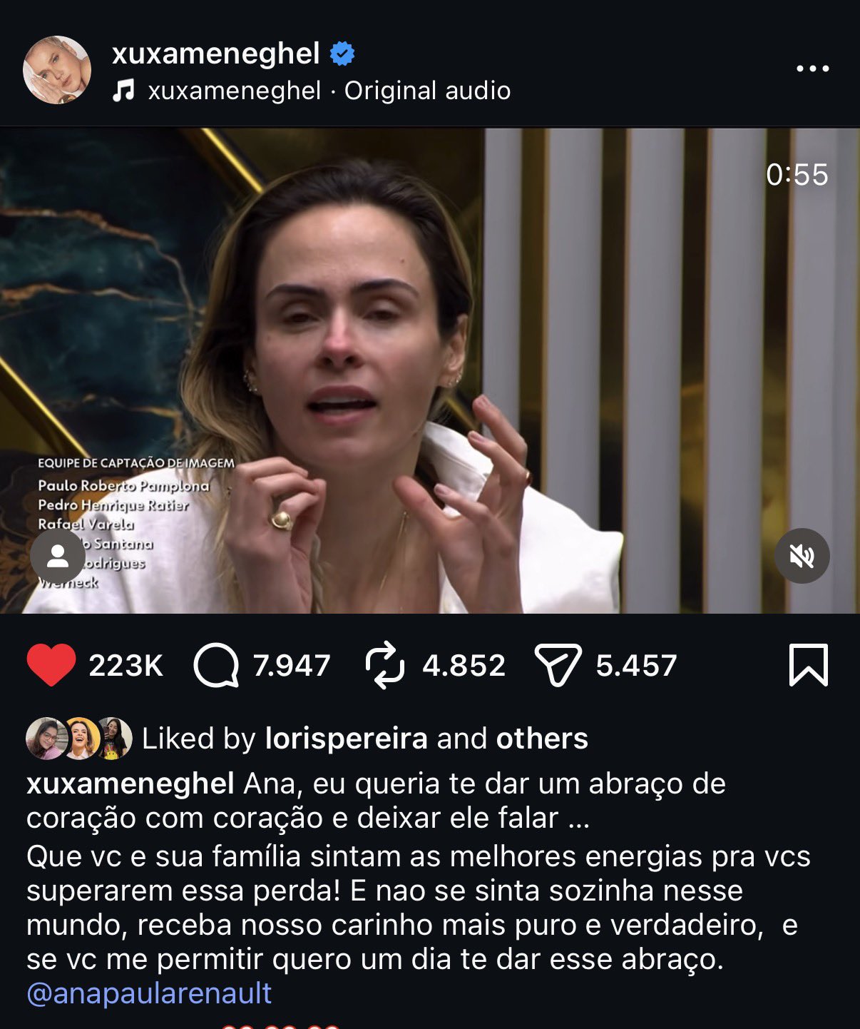 Além dos ex-brothers, personalidades do meio artístico também lamentaram a perda. Entre elas, as apresentadoras Xuxa Meneghel e Tati Machado, e as cantoras Tati Quebra Barraco e Majur, que se solidarizaram com Ana Paula neste momento de luto.