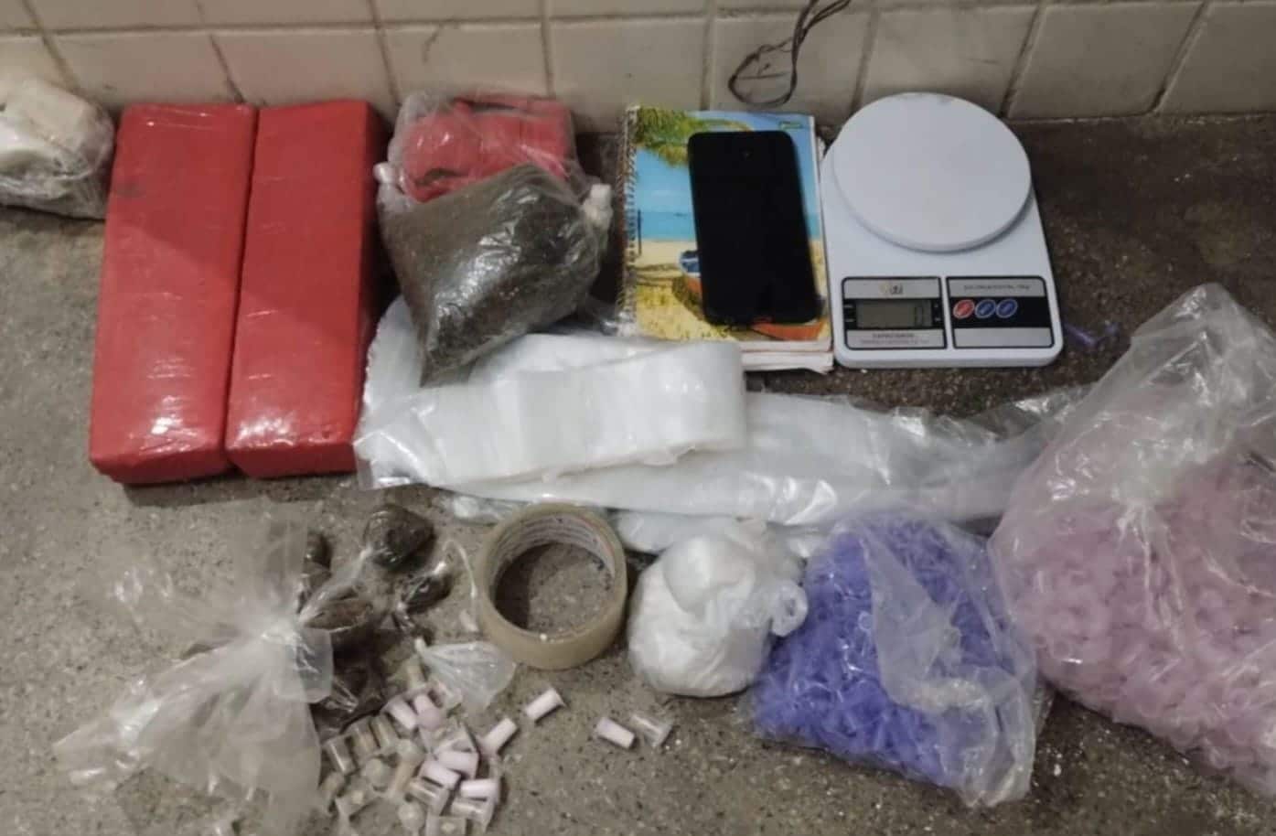 Iniciou-se uma troca de tiros e, em seguida, um dos suspeitos foi alcançado. Durante a busca pessoal foi encontrado com ele dois tabletes e meio, um saco e 13 trouxinhas de maconha, meio tablete, um saco e nove pinos com cocaína, 21 pinos com crack, além de diversas embalagens para entorpecentes, uma balança de precisão, dois cadernos de anotações e um aparelho celular.