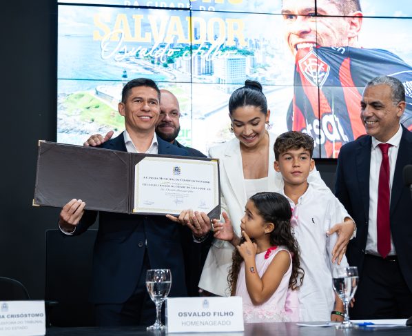 Ídolo do Esporte Clube Vitória, o atacante Osvaldo, de 39 anos, foi homenageado com o Título de Cidadão Soteropolitano em cerimônia realizada na Câmara Municipal de Salvador, nesta segunda-feira, 27.