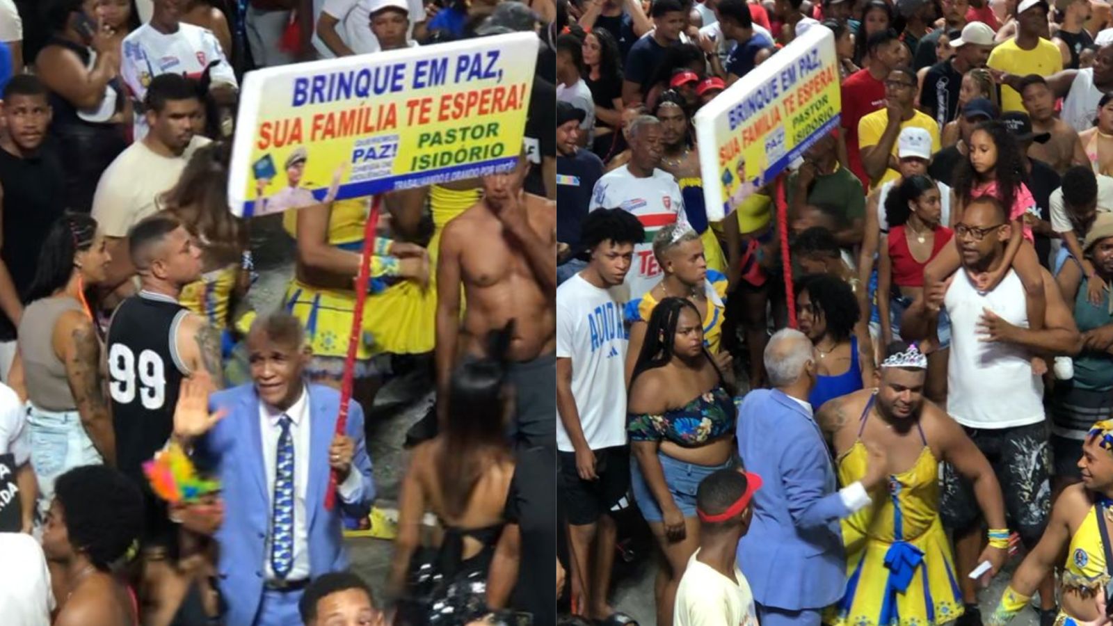 Isidório carregava uma placa com uma mensagem direcionada aos foliões: “Brinque em paz, sua família te espera.”